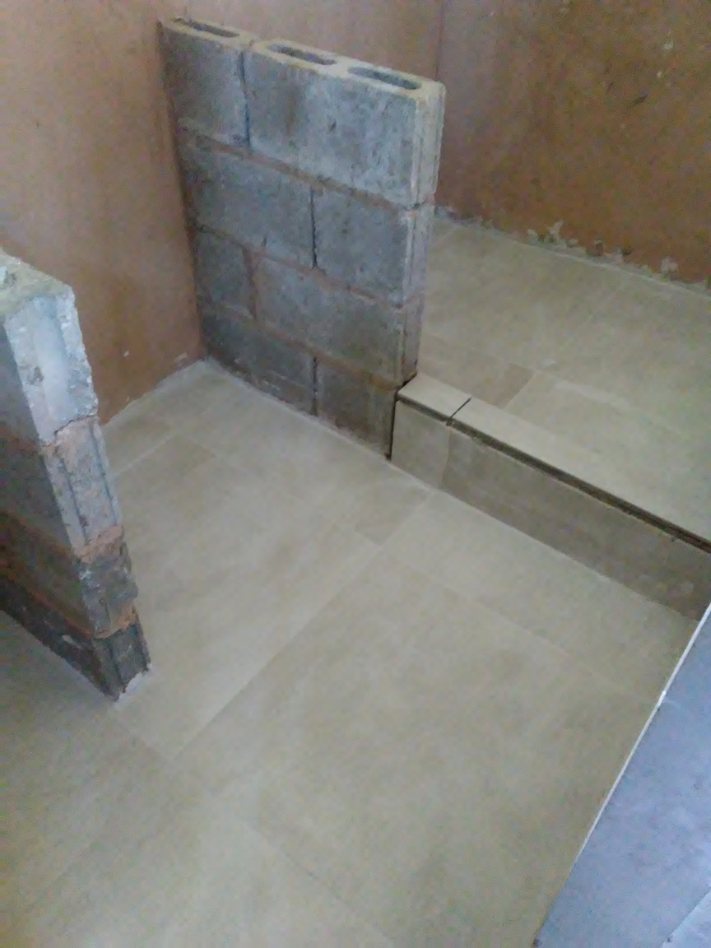 We had to use fans for circulation because there was very little breeze today, but this caused a problem, as it dried the grout too quickly. Pat continuously had to add a little more water and remix the grout. I grouted the shower, then immediately began the task of cleaning off the excess. It was fairly easy at first, but it dried faster than I cleaned, so it grew increasingly difficult to clean up.
