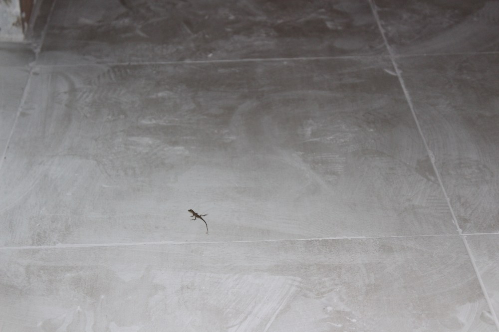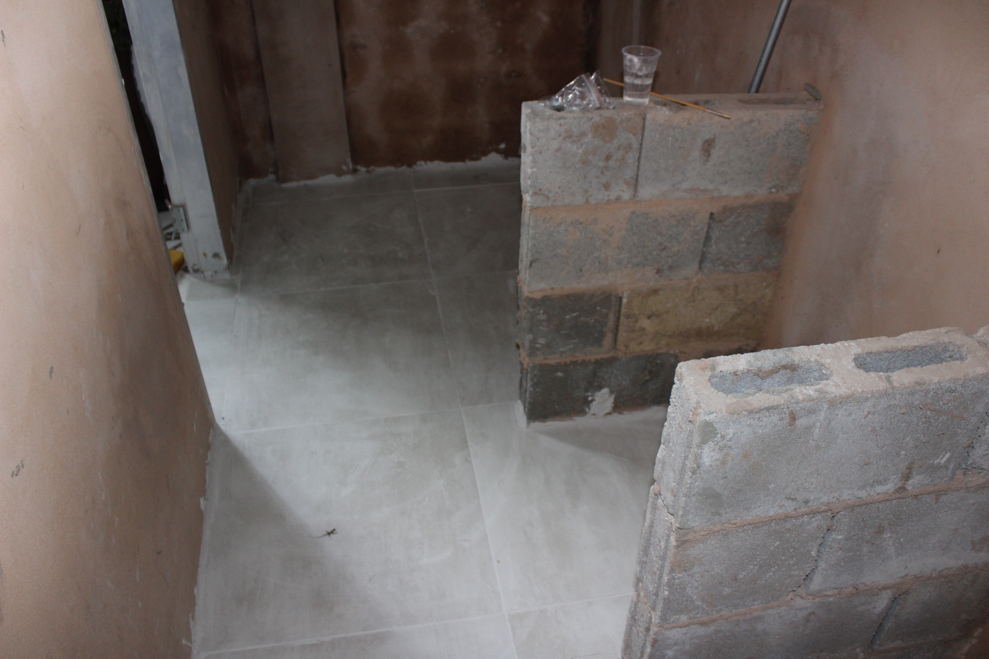 Today was to be our final work day, and indeed, the work was wrapping up. By now, all that remained to be done was grouting and sealing. Pat mixed the grout, and together he and I filled in the gaps between the tiles, starting in the shower, so that hopefully we would not have to take another sponge bath.