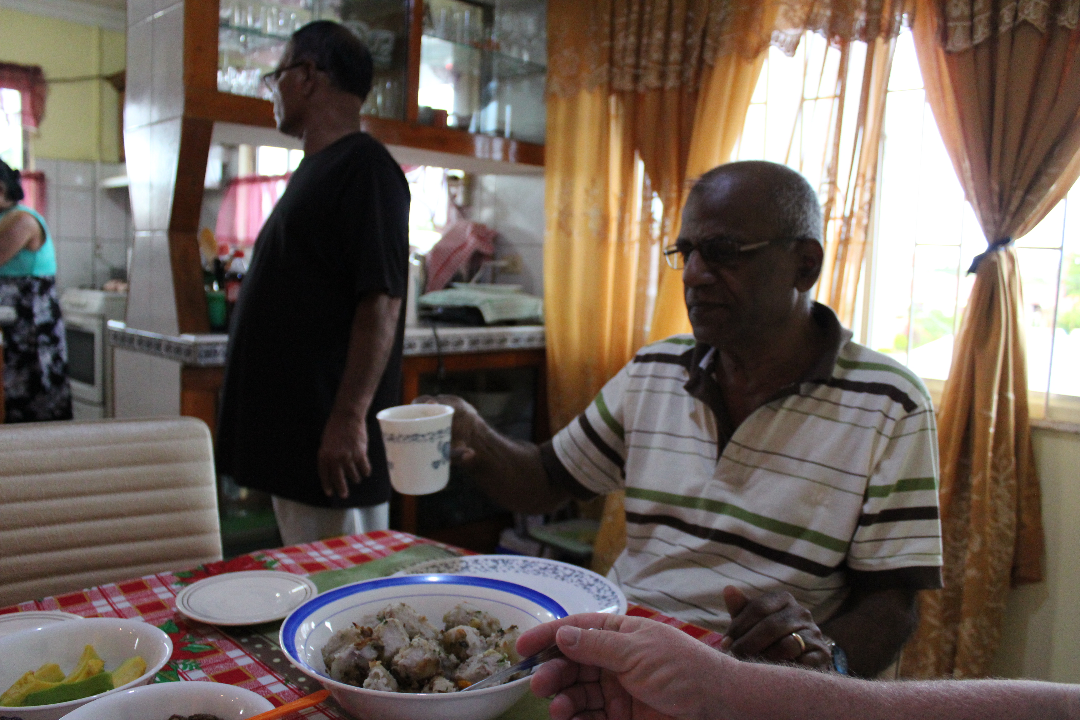 We could see that Kawal was tired, so we left the mall and headed for his nephew’s house in another part of Chaguanas. I had requested eddoes (a kind of potato), since Kawal has talked about them so much over the years, so Kawal had asked his nephew’s wife to cook “a poor-people meal” for us. When we pulled up to the house, I was struck by its beauty and said to Kawal, “This is a mighty rich house for poor-people food.” I soon found that it was no less beautiful on the inside. Kawal told them what I had said, and they laughed, then told me that it took many years to make the house look the way it does today.
