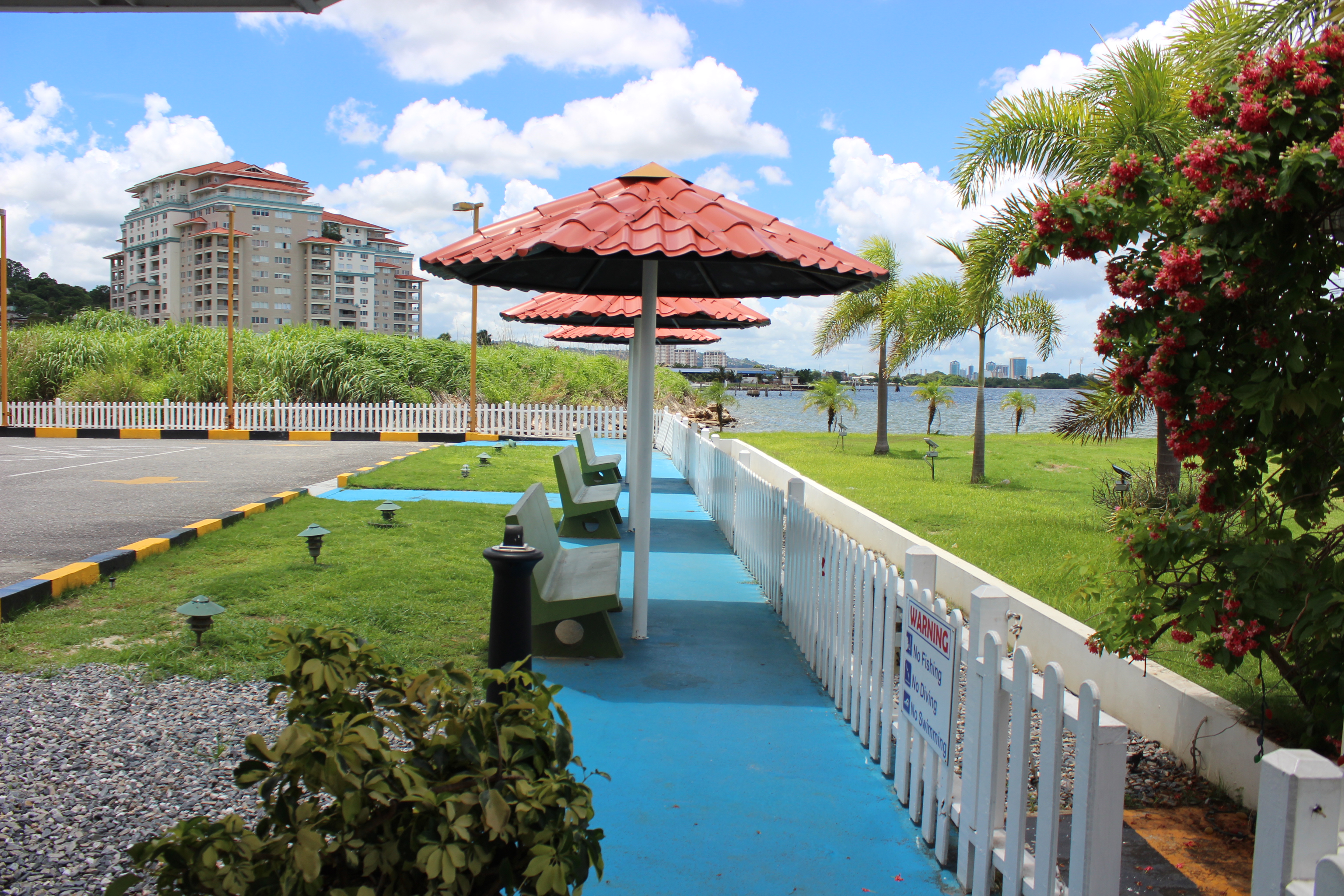 We continued our sight-seeing, sometimes driving, and sometimes stopping to get a better look. Kawal took us to the hospital he prefers to visit when the need arises. First we enjoyed the beautiful pavilion and waterfront, then we went inside to meet two of the nurses. He also stopped by the clinic where the doctor checked and redressed the wound on his toe.
